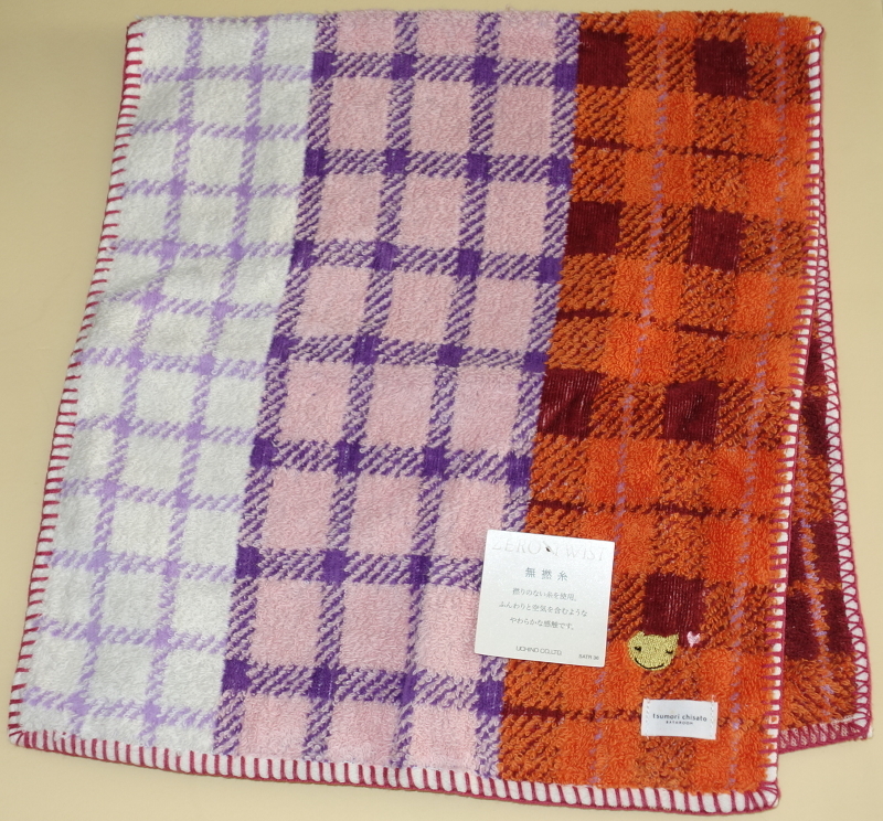 > ツモリチサト tsumori chisato★ワコールx内野★フェイスタオル★綿100%★ネコフェイス刺繍・チェック柄・縁取り刺繍★オレンジxピンク