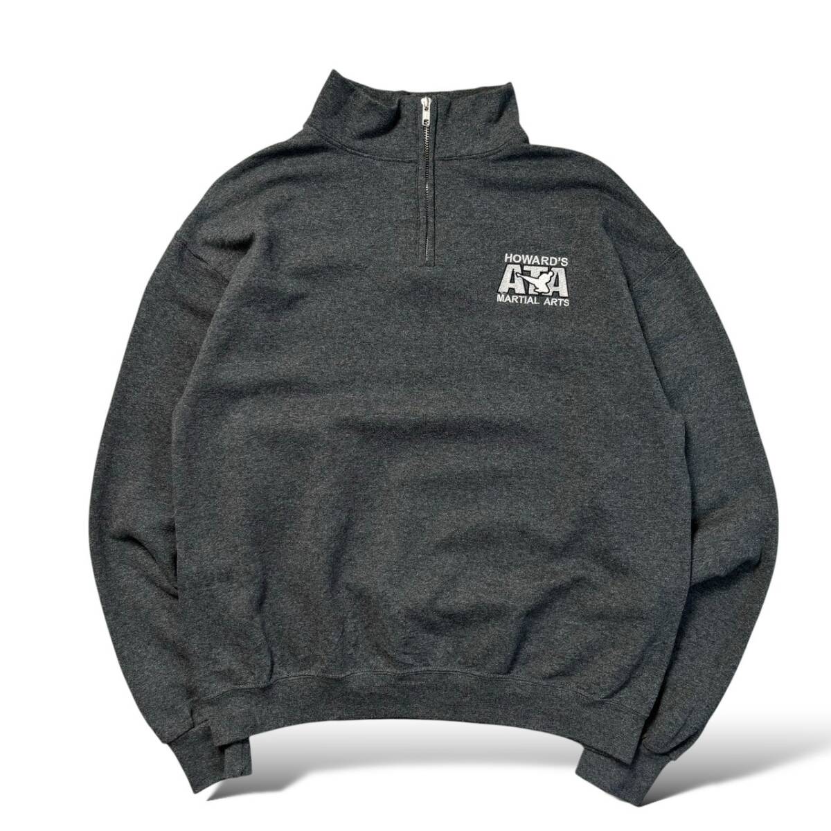 - Mサイズ USA古着 JERZEES 企業ロゴ 刺繍 ワンポイント 一点物 格闘技 マーシャルアーツ ハーフジップ スウェット トレーナー 裏起毛 グレー