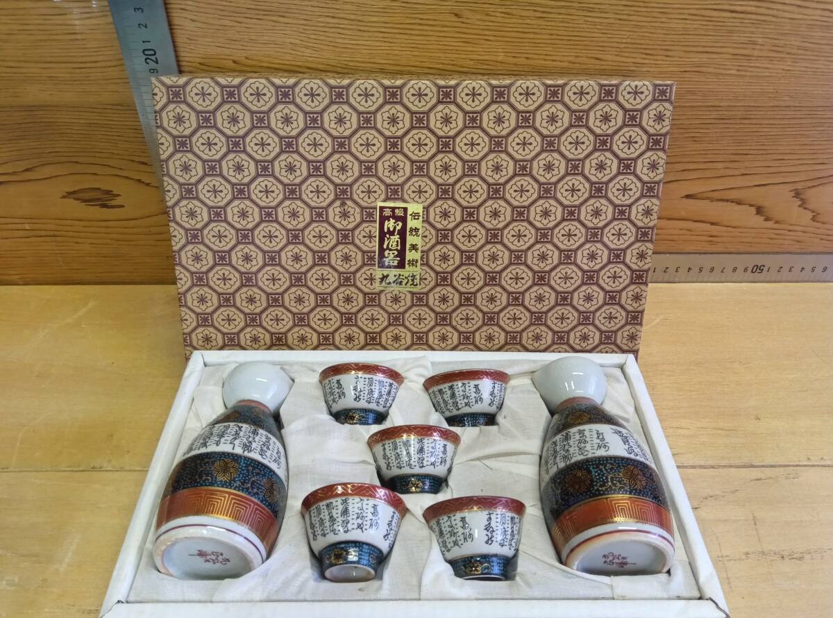 > 24112506 九谷焼正峰 高級御酒器 徳利 お猪口セット 青粒細字 酒器セット 金彩 漢文 未使用品 美品