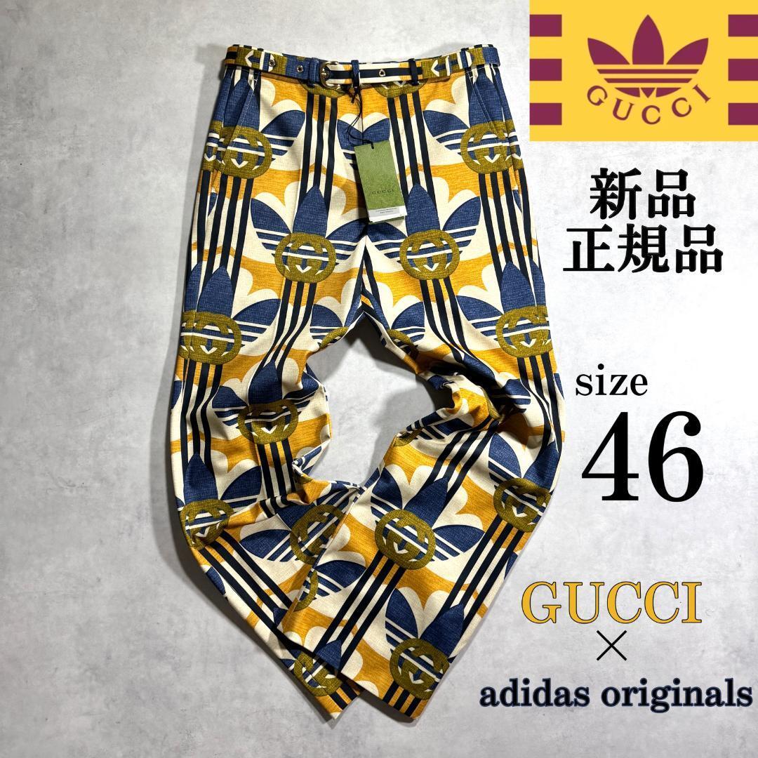 - 新品 46size グッチ × アディダス 総柄 トレフォイル パンツ GUCCI adidas ベルト ストライプ 人気 正規品 スラックス ライン ネイビー