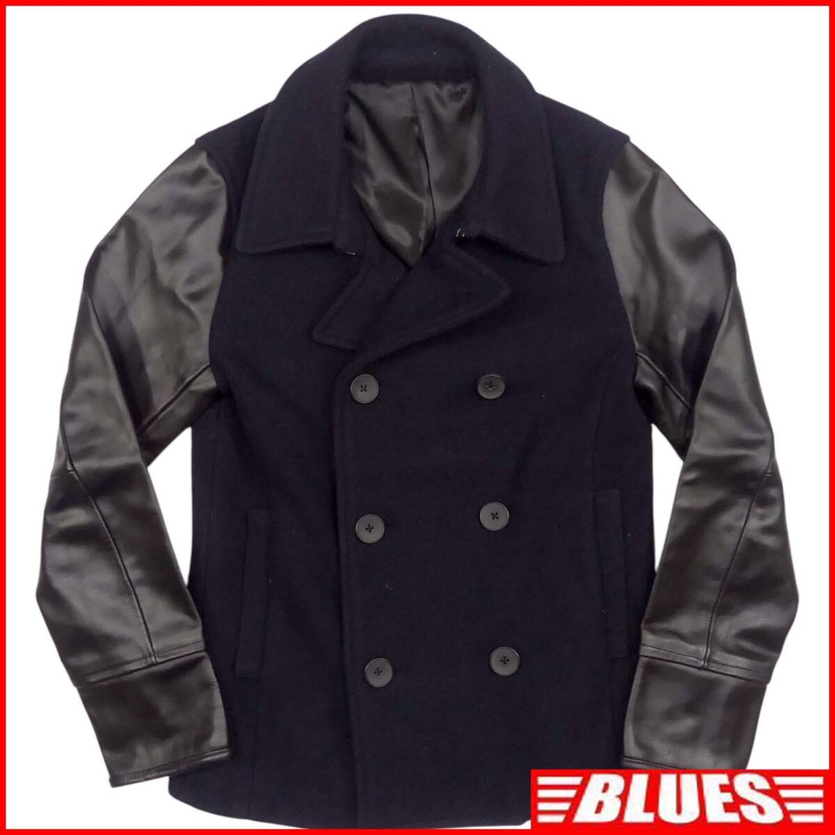 - 即決★N.B.★メンズ M レザーコンビピーコート 黒 ネイビー 紺 本革 ジャケット 本皮 革ジャン ハーフコート