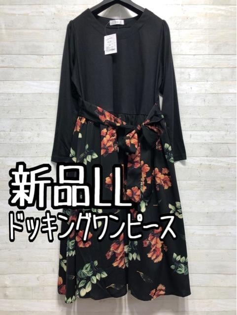 - 新品☆LL黒系×花柄♪ウエストリボン素敵なドッキングワンピース〇A758