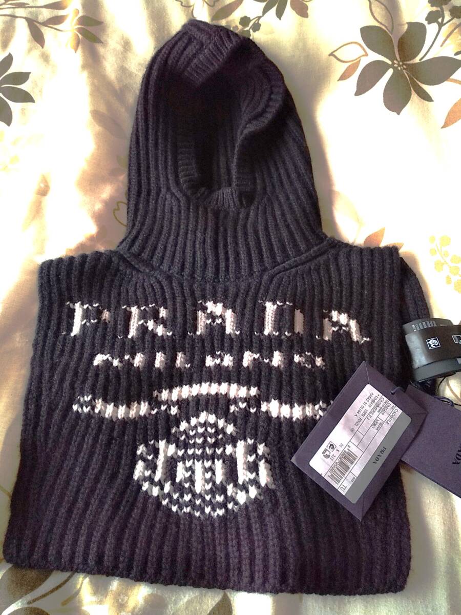 - 新品PRADAプラダ超稀少フード付きピュアカシミアフロントロゴニットネックウォーマーブラック