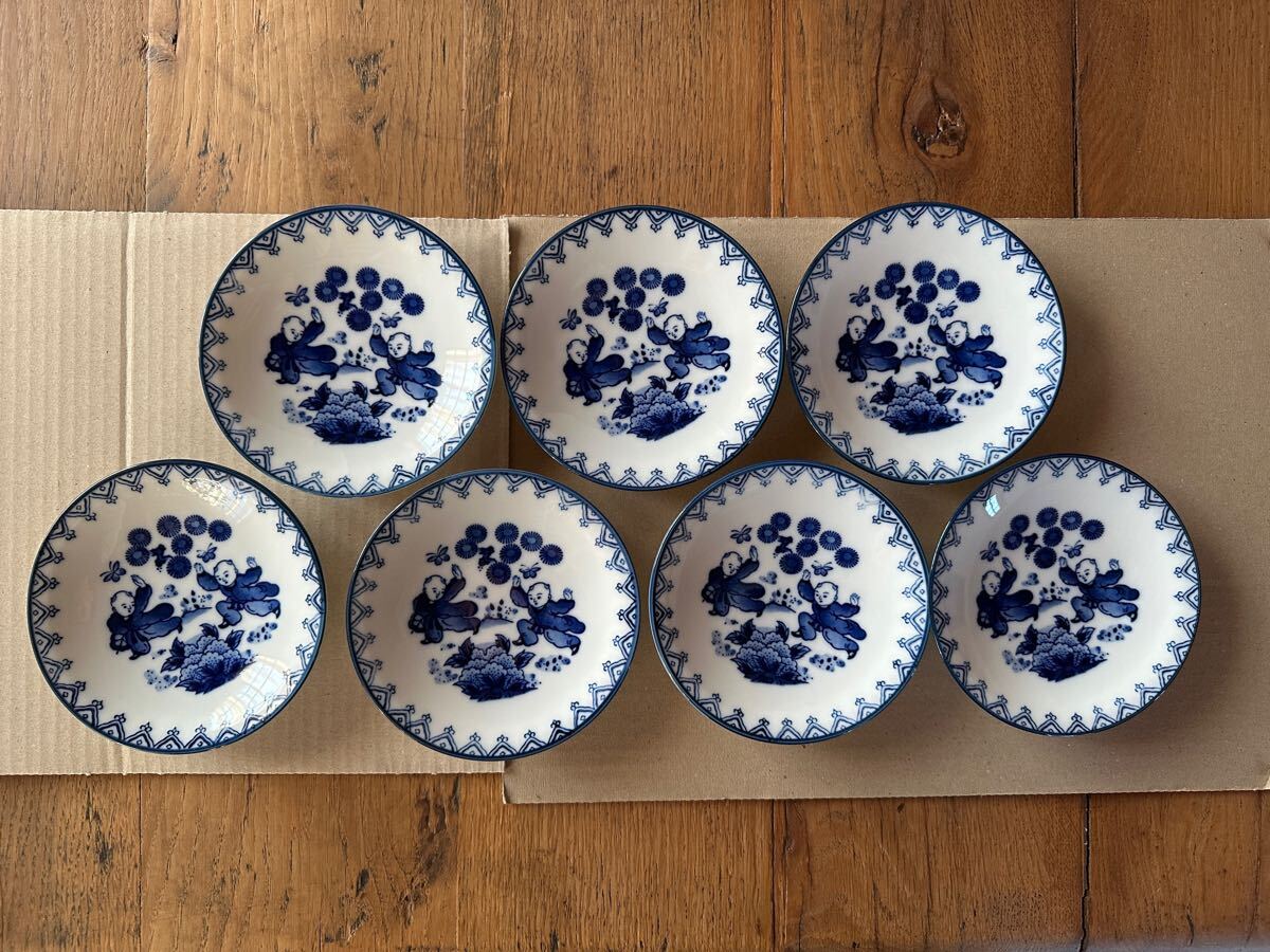 - 送料込み 古い 荻窯 唐子 小皿 7枚セット 染付 、 有田焼 レトロ 昭和 青色