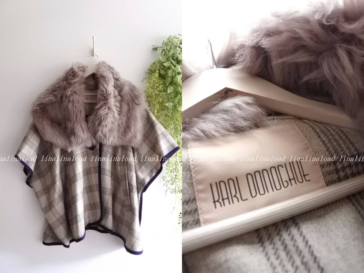 - 期間限定お値下げ 未使用 カールドノヒュー*艶やかな ラムファー 襟 上質ウール ケープ ポンチョ ベージュ系 チェック