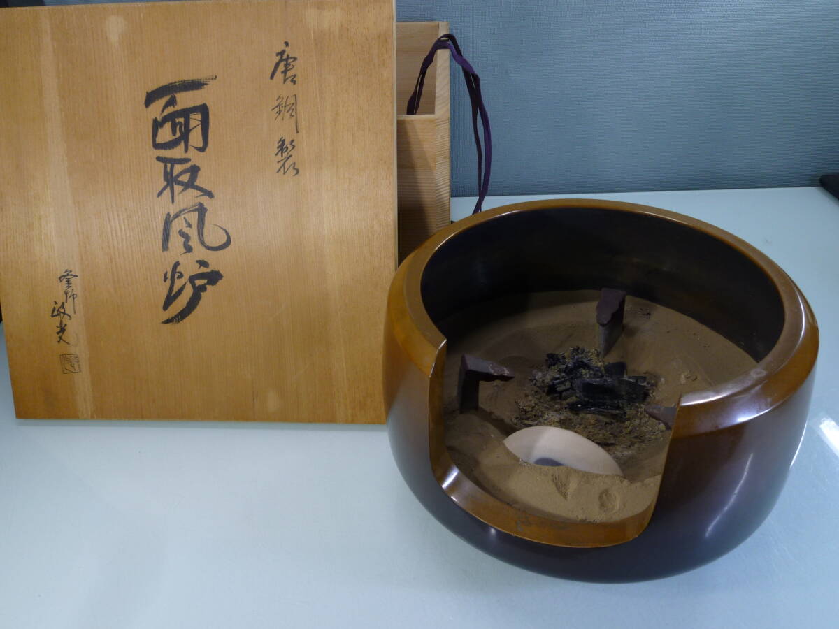 - 面取風炉 唐銅製 五徳 灰入り 釜師 菊池政光造 中古