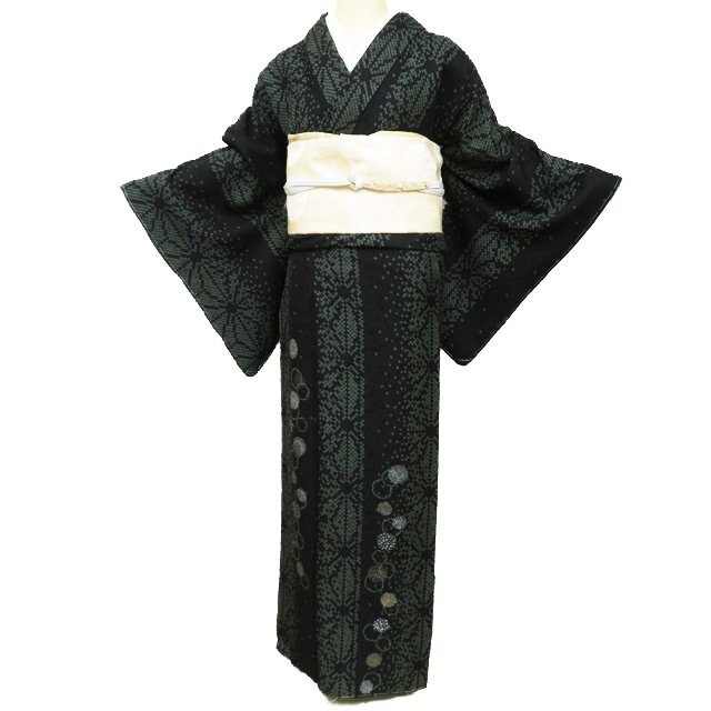 - 特選 訪問着 着物 未使用 正絹 袷 鹿の子模様 麻の葉模様 雪輪 黒色 老竹色 金銀 身丈167cm 裄68cm L トール ワイド きもの北條 A1125-6