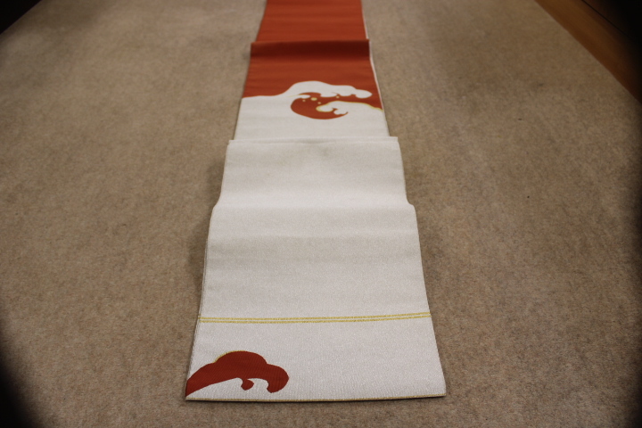 > きもの今昔7954 袋帯 西陣織つづれ織本爪 波頭 煉瓦赤色と白地銀糸 貴重な逸品 帯の長さ40cm