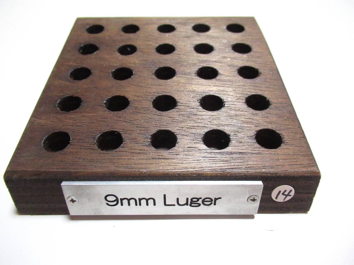 > 木製カートリッジスタンド カートリッジホルダー中古品 9mm Luger サイズ約12cm×約11cm×約1.8cm