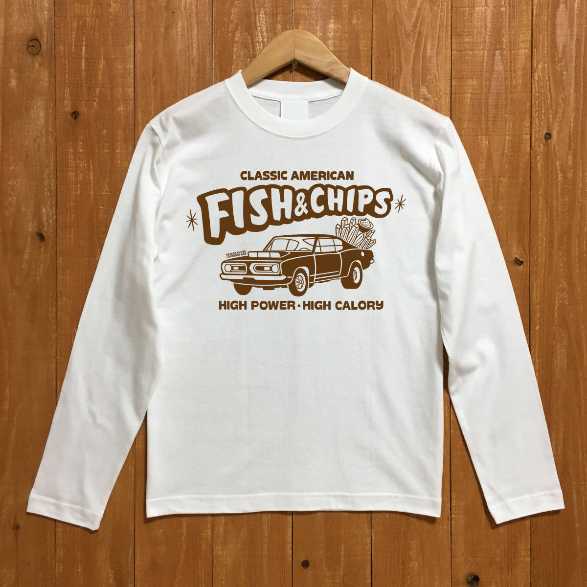 - ■FISH & CHIPS ロンT■Lサイズ(ホワイトxブラウン)アメリカ アメ車 モパ- MOPAR PLYMOUTH BARRACUDA ハンバーガー ポテト