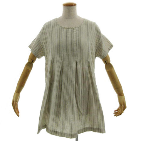 - ピュアルセシン pual ce cin チュニック カットソー 半袖 袖ロールアップ バックボタンダウン コットン ストライプ アイボリー 青