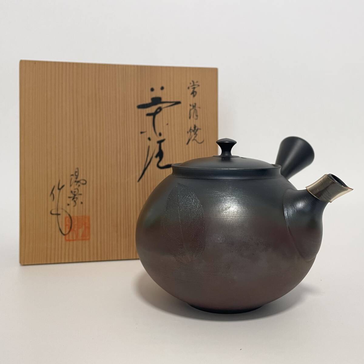 - 常滑名人 水野陽景 作 葉文 窯変 茶注 急須 名工 常滑急須 常滑焼