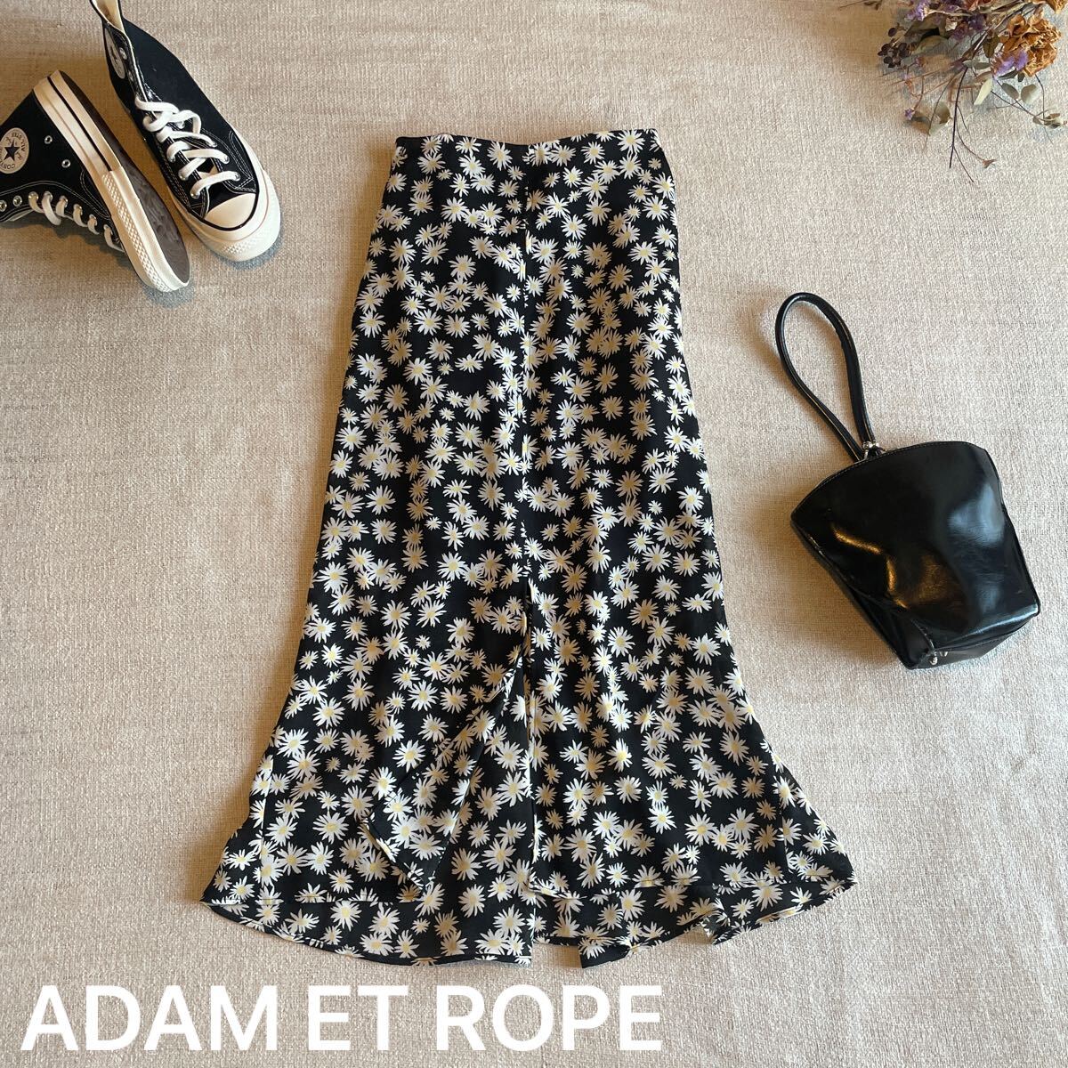 > アダムエロペ バックギャザースカート 花柄 ロングスカート 黒 レディース36サイズ 美品 フレア スリット シフォン 大人可愛い