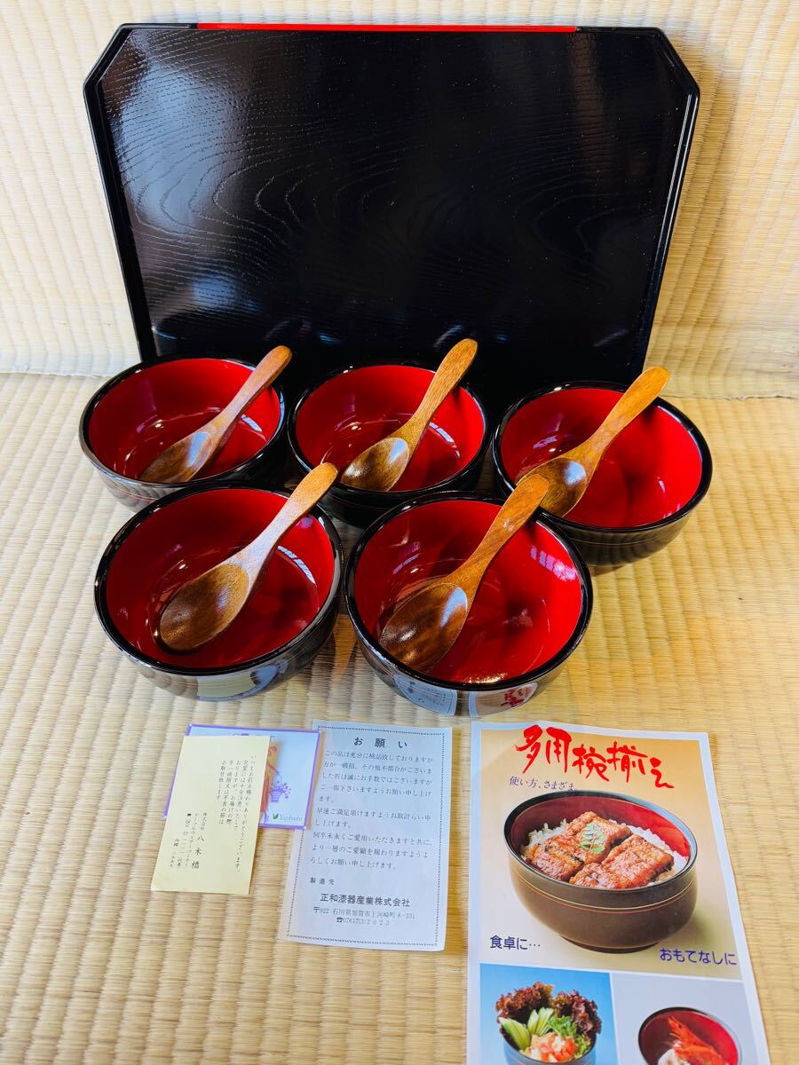 - 未使用品 漆器 5客 セット 木製 手彫り レンゲ スプーン 八木橋 多用椀揃え 盆 お盆 食器 昭和レトロ オシャレ