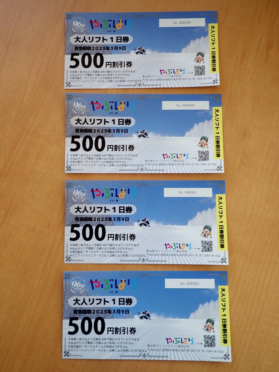 - 【やぶはらスキー場】やぶはらスキー場 4枚セット 2024-25 大人リフト1日券 500円割引券