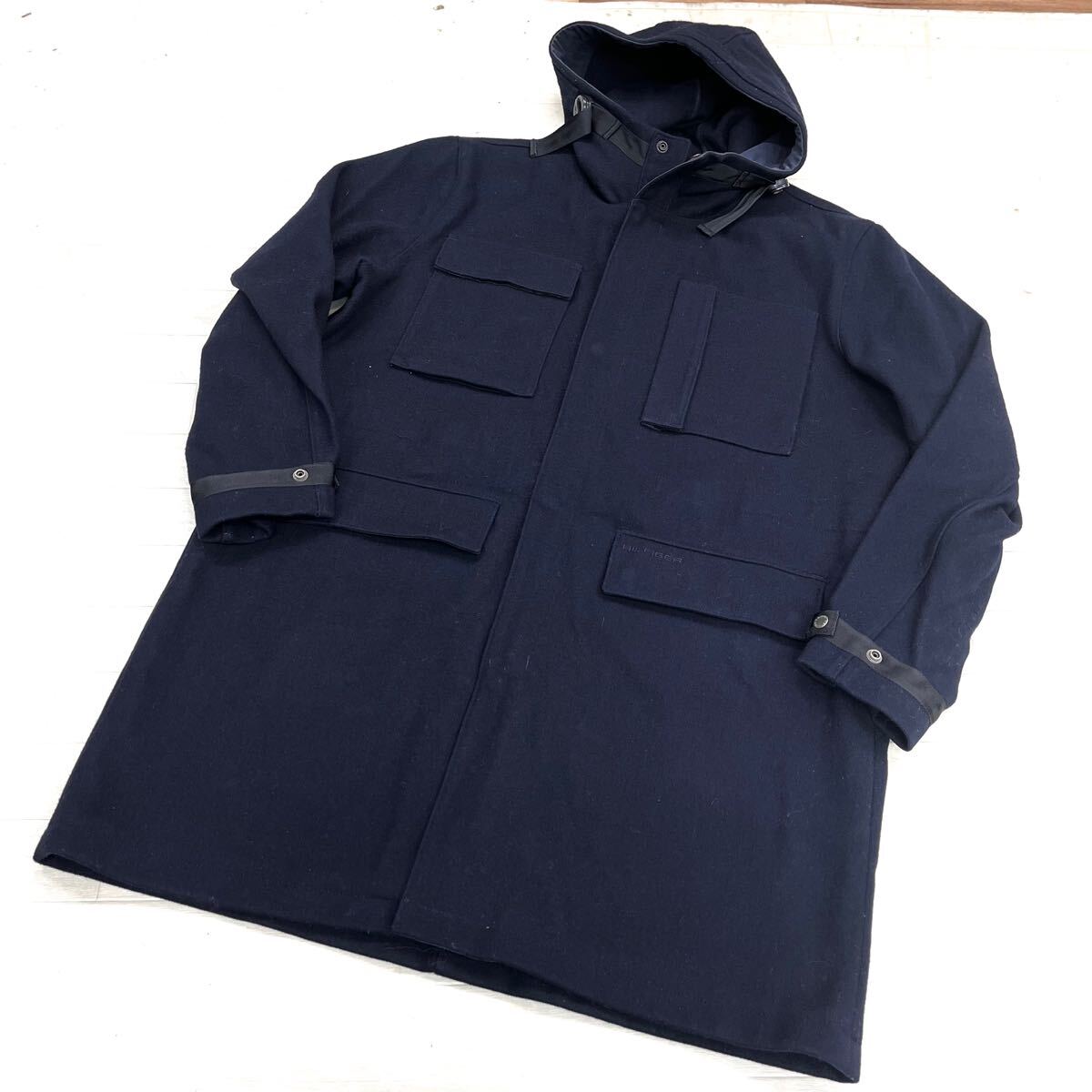 > 1673◎ TOMMY HILFIGER トミーヒルフィガー トップス ウール コート ロング丈 フルジップ 無地 カジュアル ネイビー メンズL