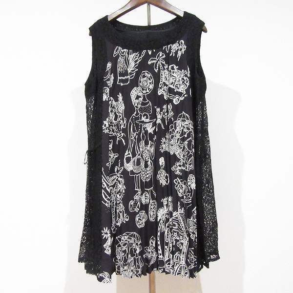 - #snc レリアン Leilian チュニック 9 黒 白 ノースリーブ プリーツ レース 総柄 日本製 美品 レディース [916227]