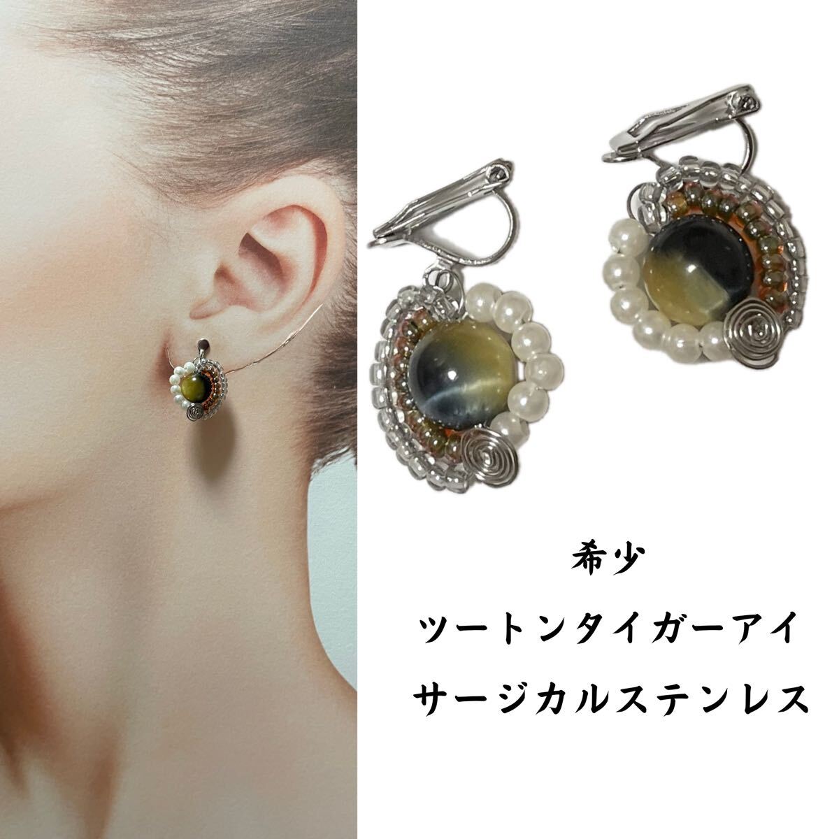 - TT34. 天然石 イヤリング 希少 レアストーン ツートン タイガーアイ アレルギーフリー ニッケルフリー サージカルステンレス ハンドメイド