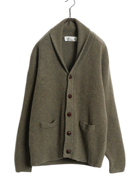 - 00s オービス ショールカラー ニット カーディガン メンズ L 古着 オールド ラム ウール セーター リブ編み チャンキー アウトドア カーキ