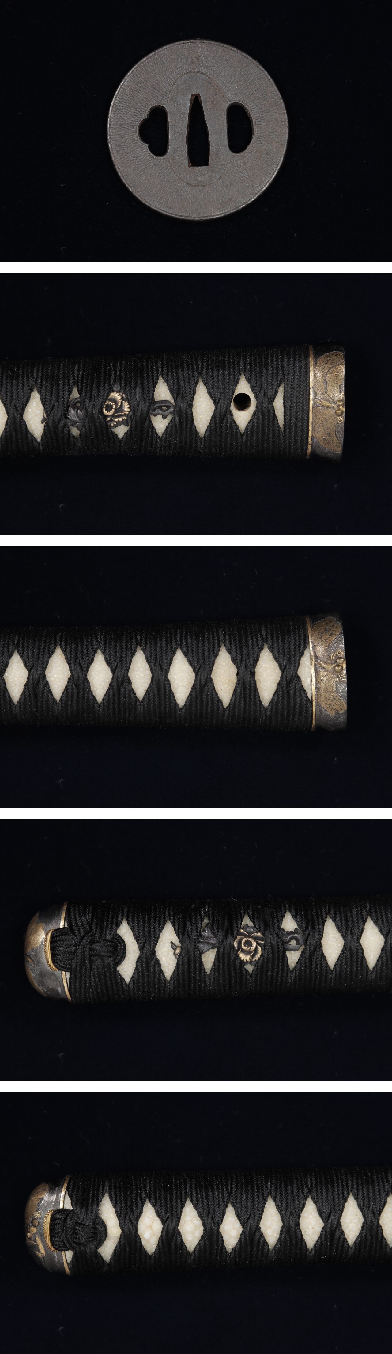 - 天地堂《刀剣 武具》日本刀 脇差 貴重刀剣認定証 越前継広 勝虫蜻蛉金具 縁頭 在銘鉄鐔 拵 鞘 はばき 切羽 鵐目 縁金 鐺 小柄 笄 打刀 短刀