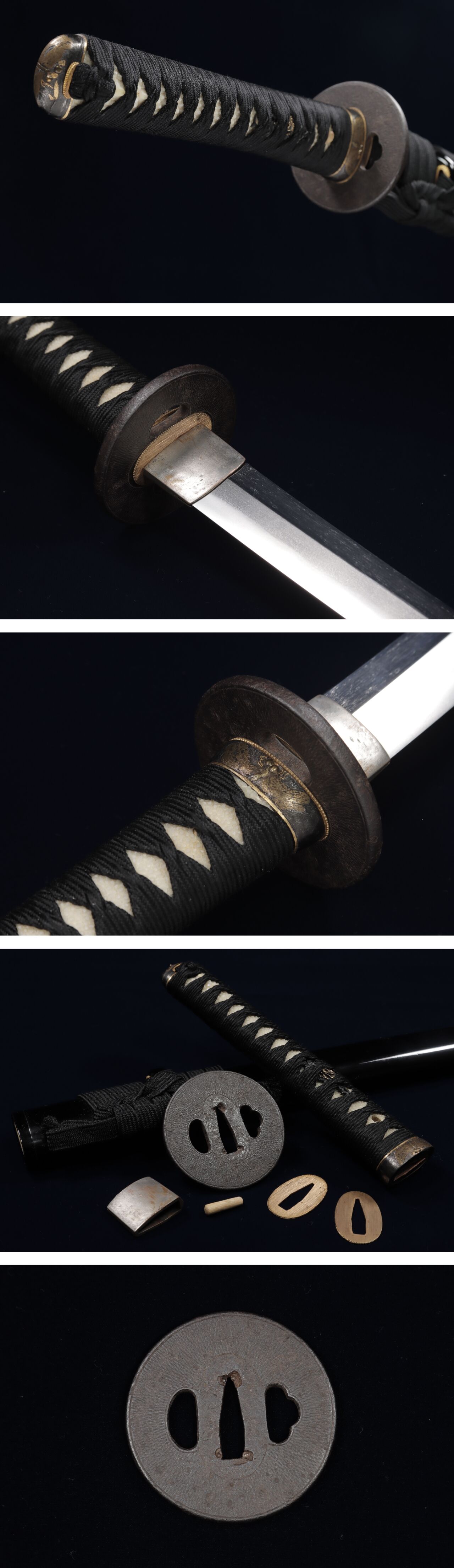 > 天地堂《刀剣 武具》日本刀 脇差 貴重刀剣認定証 越前継広 勝虫蜻蛉金具 縁頭 在銘鉄鐔 拵 鞘 はばき 切羽 鵐目 縁金 鐺 小柄 笄 打刀 短刀