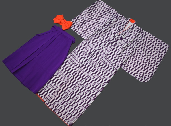 - A41-26【凛々】即決 中古品 ポリエステル 女児 七才用 七五三 卒園式 着物 袴 帯 紫 矢絣 3点組