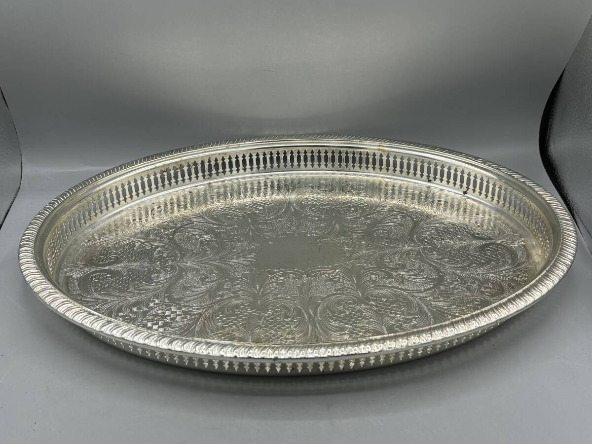 - 英国 シルバー P 楕円形 オーバル型 シルバープレート 透かし 銀P お盆 トレー ギャラリー トレイ 銀メッキ (BS-1)* ビンテージ