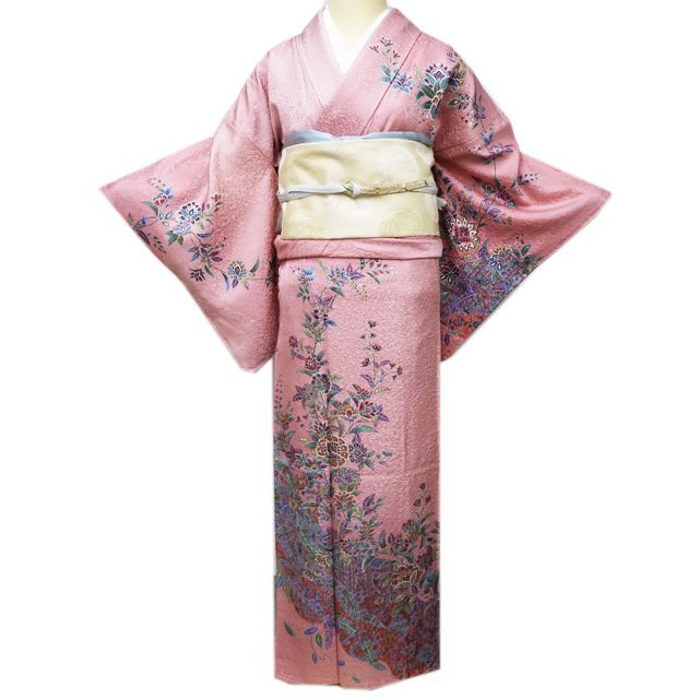 - 訪問着 着物 中古 正絹 袷 フォーマル 花の図 更紗 地模様 薄紅色 多色 金 身丈157cm 裄63cm M きもの北條 A1133-6