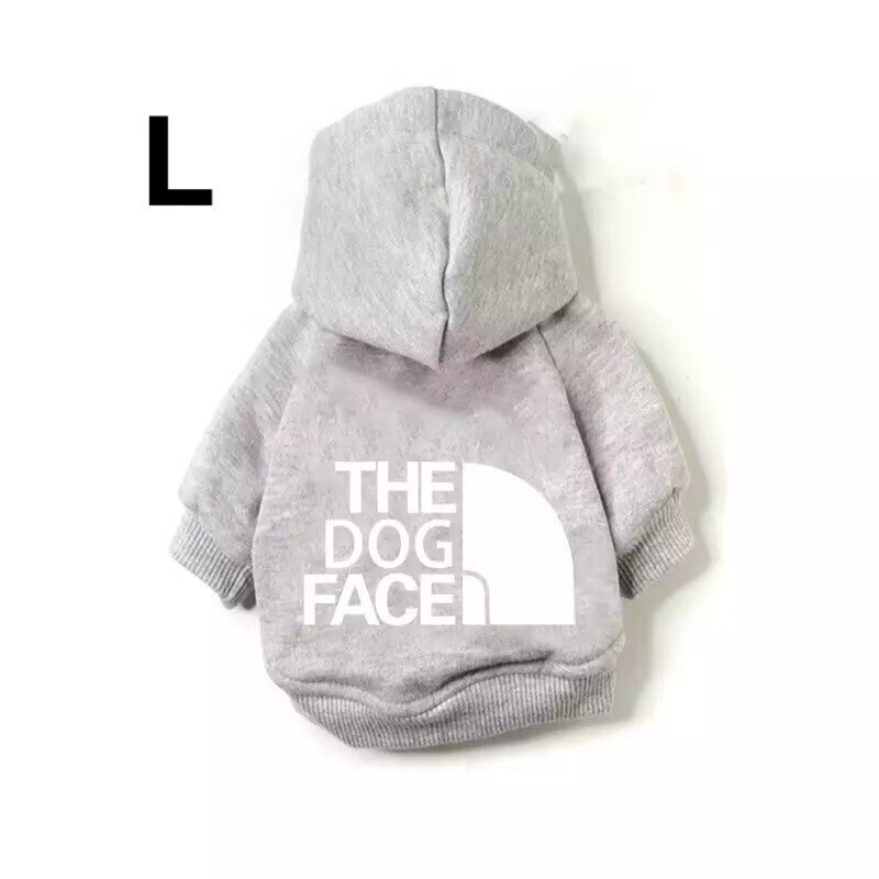 - 暖かい裏起毛♪ドッグフェイス犬服パーカーペット用洋服グレーLサイズ白文字!
