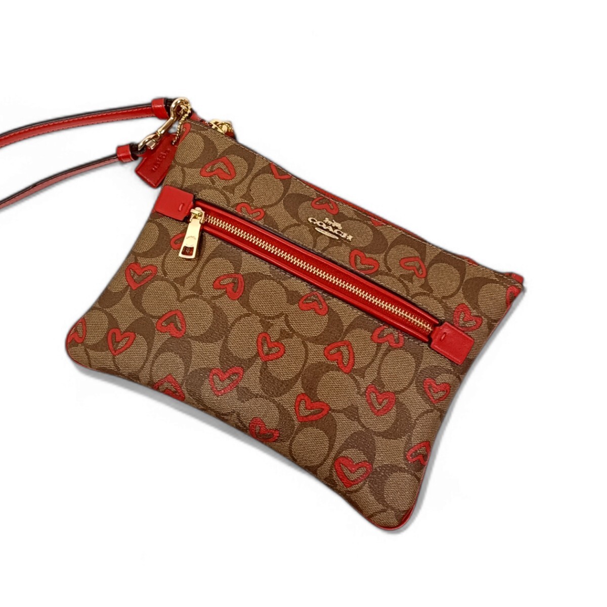 - 【美品】 正規品 コーチ COACH クラッチバッグ シグネチャー レザー ハート ポーチ 小物入れ ベージュ 赤 レッド ハンドバッグ ミニ 鞄