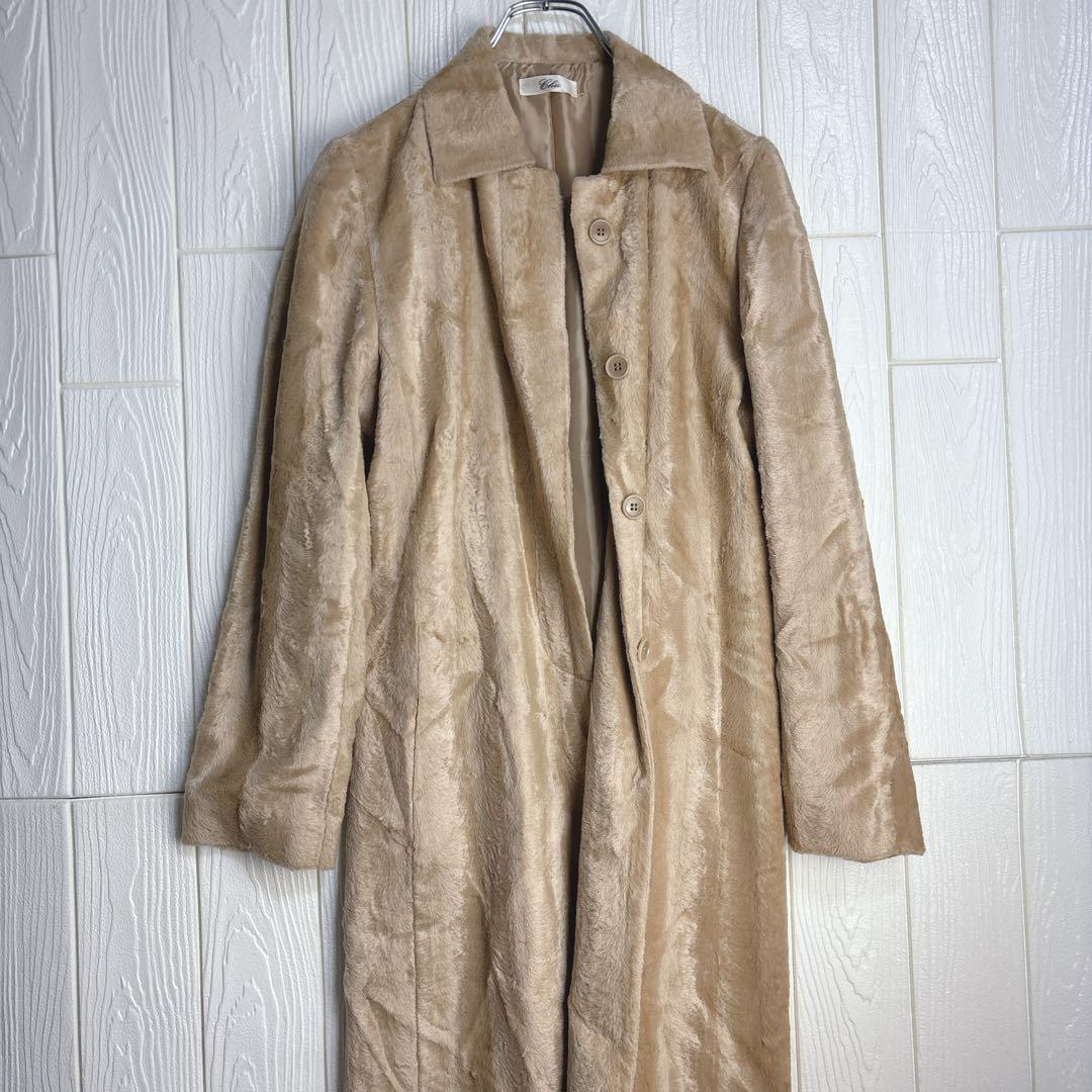 - ベージュ ロングコート 36cm肩幅 89cm着丈 光沢あり