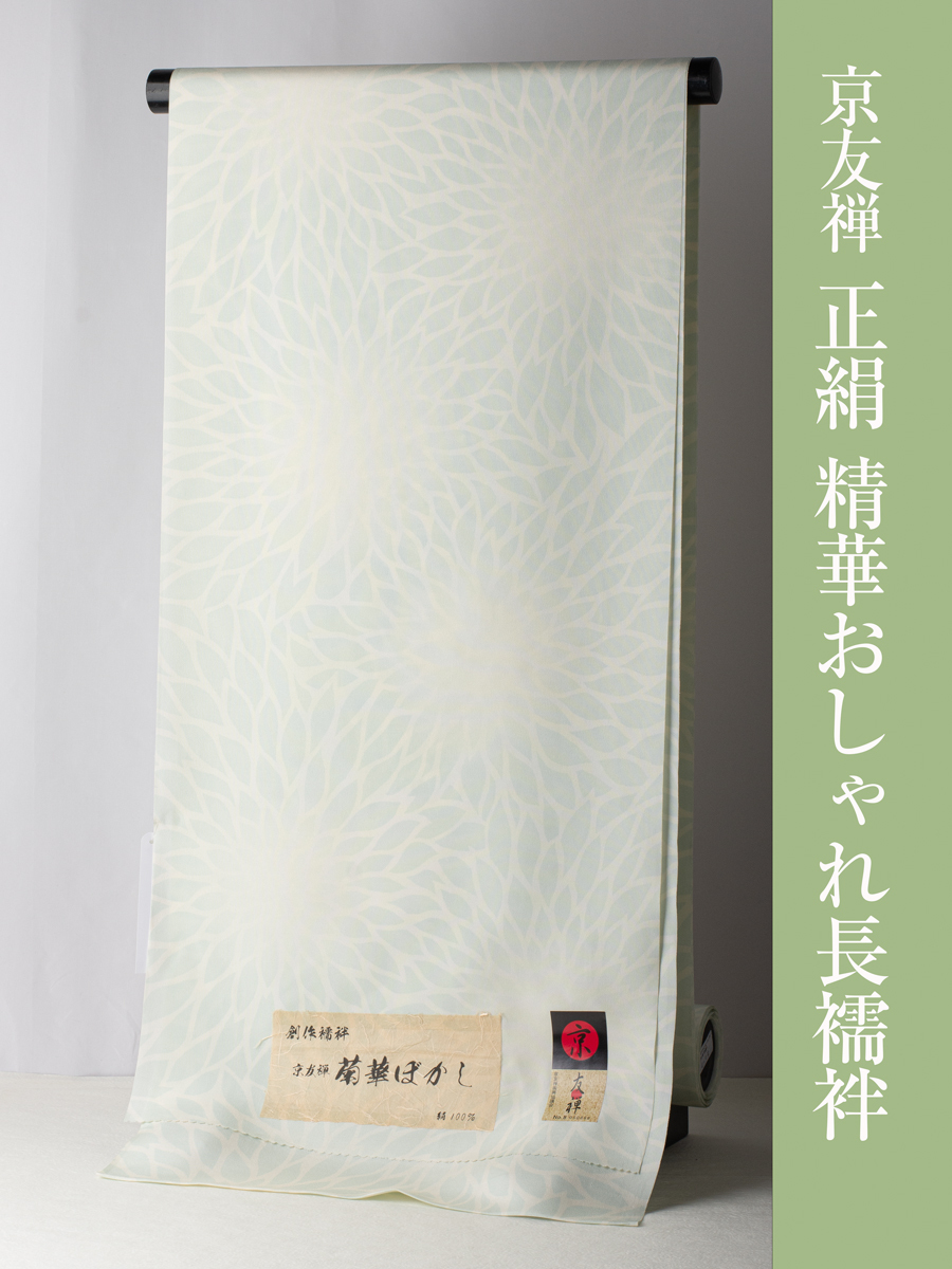 - 【京友禅正絹精華おしゃれ長襦袢】(むじな菊・淡ひわぼかし) 京友禅 長襦袢 精華 反物 正絹 柄物 小紋 紬 カジュアル向き