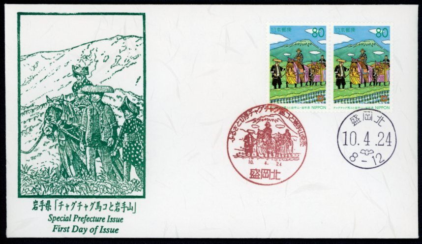 - 1394 【FDC】ふるさと 岩手県「チャグチャグ馬コと岩手山」[盛岡北/10.4.24/鳴美版](解説書なし)