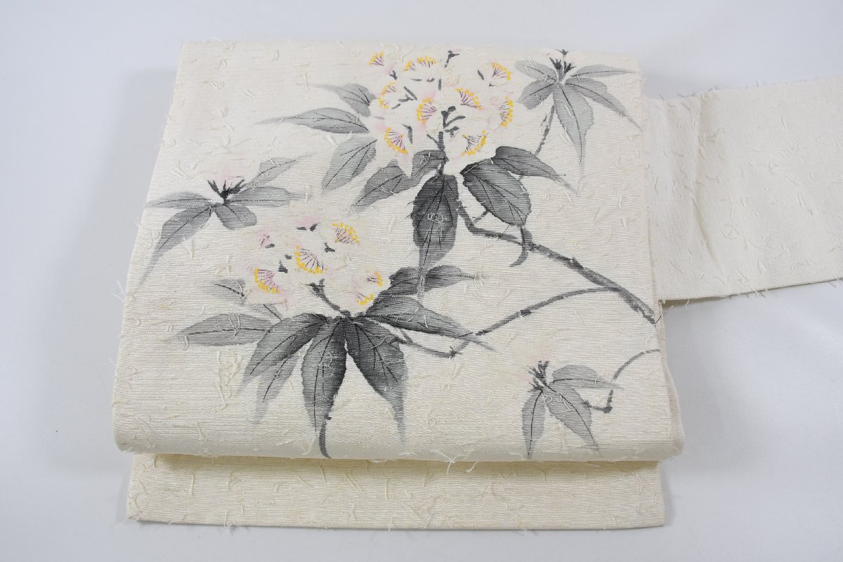 - 名古屋帯 髭紬 手描き 落款 花 帯丈356cm ★着物屋 ne-13801 桜庭呉服店