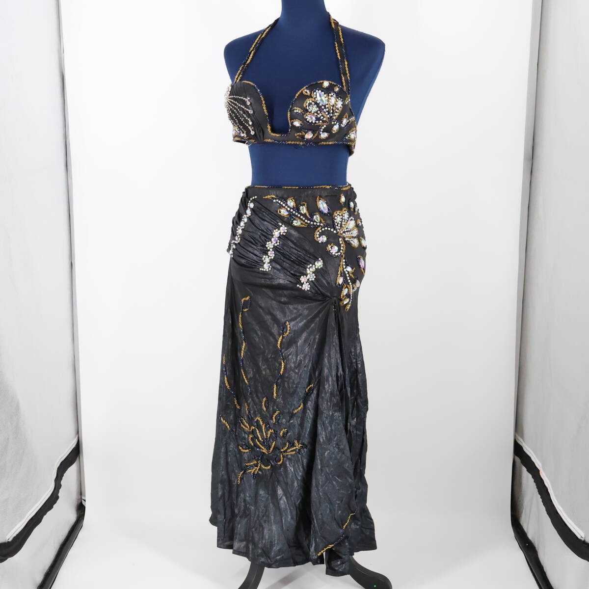 - 『送料無料』【ベリーダンス用 オリエンタル衣装】ブラック ラインストーン ビーズ 豪華 黒 シルバー 光沢 艶 綺麗 煌びやか スリット入り