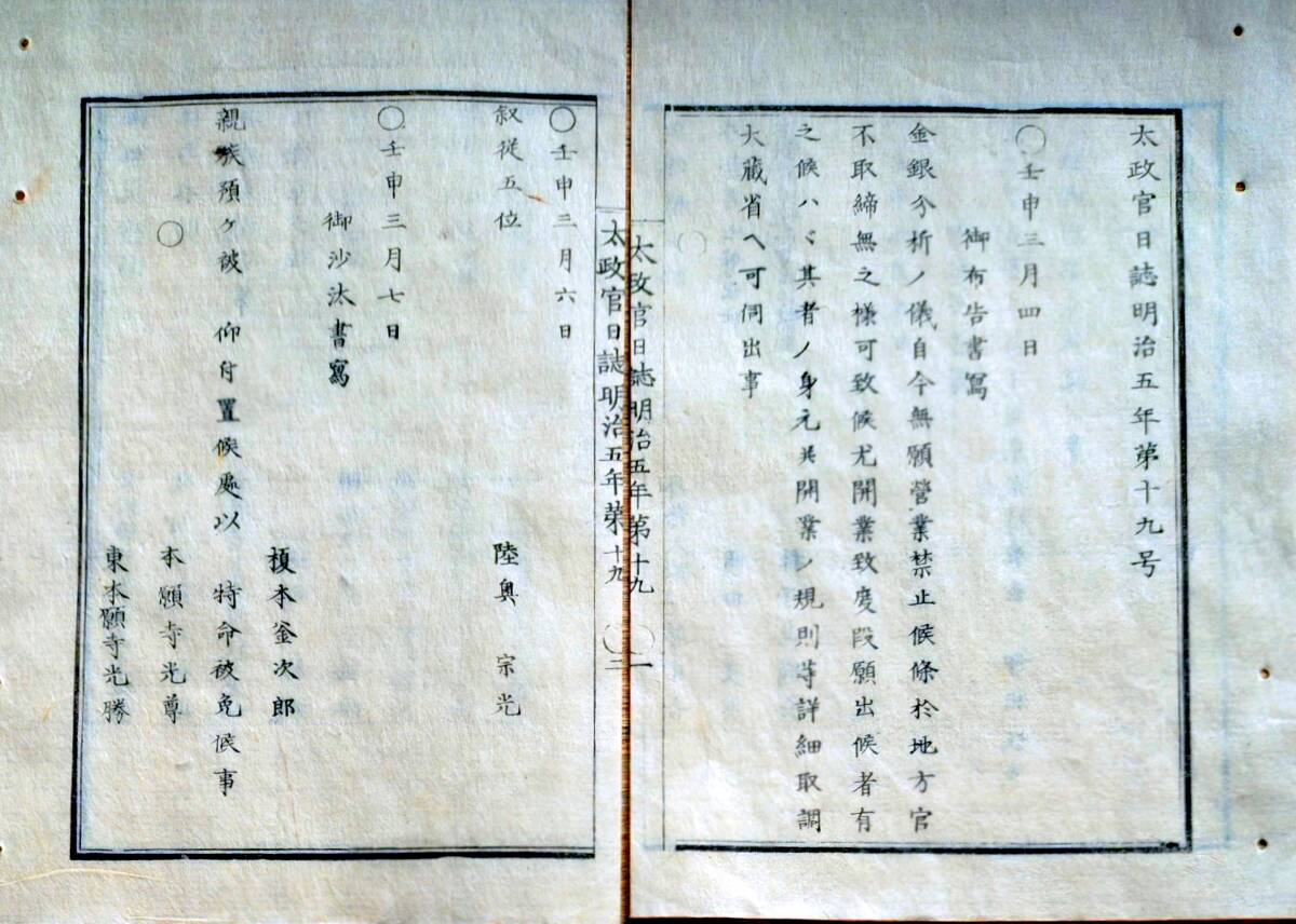 - f25012519〇太政官日誌 明治5年壬申 第19号〇金銀分析無願営業禁止 榎本武揚特命〇和本古書古文書