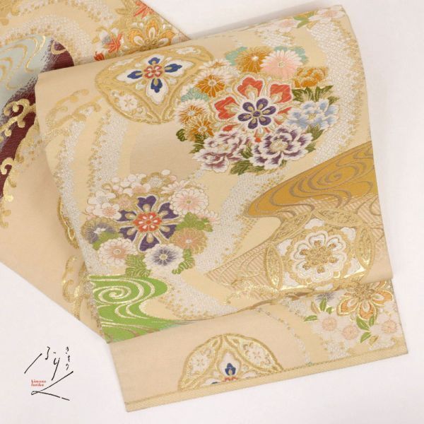 - 【袋帯】 豪華唐織 煌びやか 流水花丸鈴文 肌色 正絹 着物 FY11-17