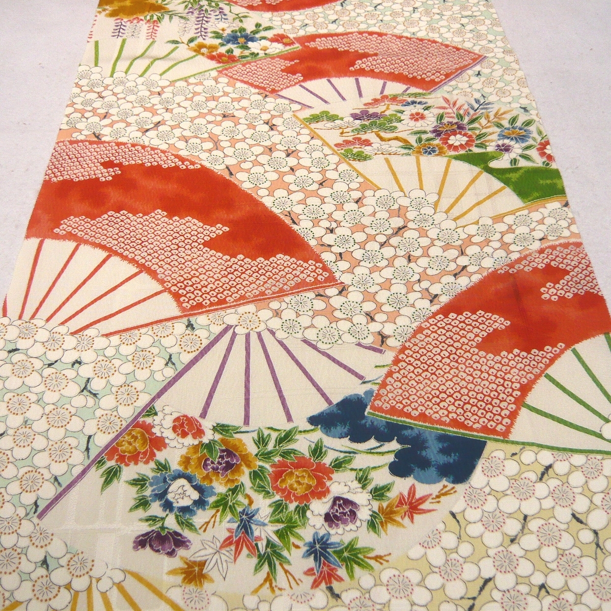 - 着物はぎれ 端切れ 正絹 ちりめん 縮緬 美品 花の扇 鹿の子の扇 梅 160㎝ 手芸 細工 小物づくり 半襟にも
