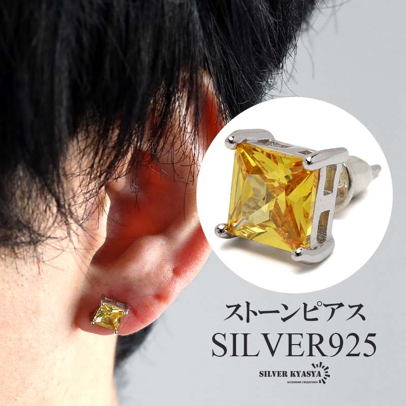- シルバー925 シトリンピアス イエロー 一粒ピアス ストーンピアス スタッドピアス スクエア 金属アレルギー対応 片耳 1点