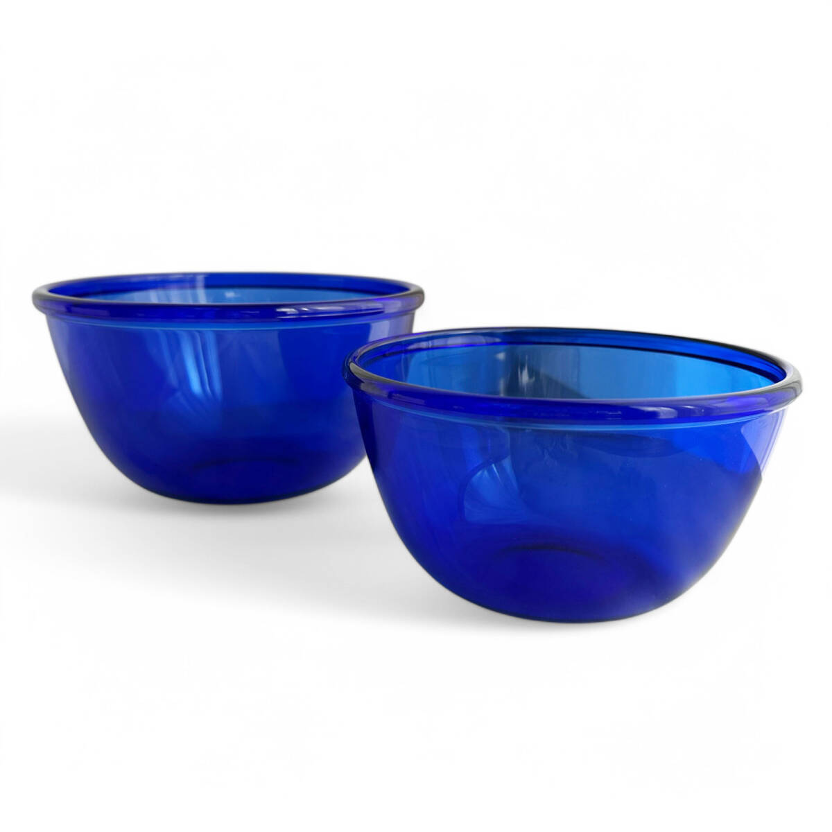 - T7-259 フランス製 ガラス ラウンド ボウル 2個セット 入れ子 18cm 21cm 青/ブルー 食器
