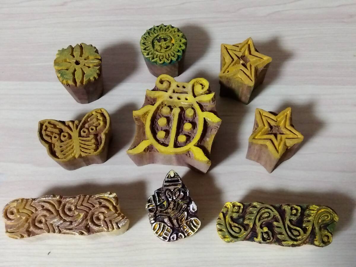 - USED 即決\1580 インド製 木版スタンプ 9個セット てんとう虫 蝶々 ブロックプリント
