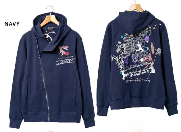 > 黒菟華 「黒いうさぎの上映会」総刺繍斜めZIPパーカー◆LIN ネイビーXXLサイズ AL-759074 和柄 和風 兎 刺繍 ユニセックス