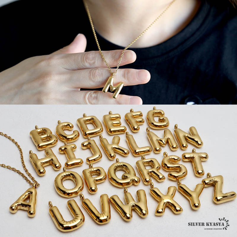 > (V、60cm) イニシャルネックレス バルーン ゴールド ステンレス 18KGP あずきチェーン ぷっくり 金属アレルギー対応