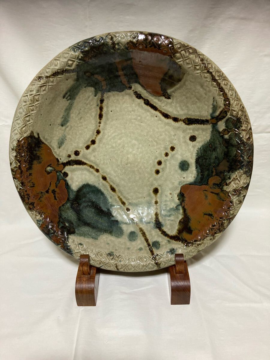 - 民藝 押紋大鉢 作者不明 骨董 大皿 民芸 三彩 鐵釉 呉須釉 地釉
