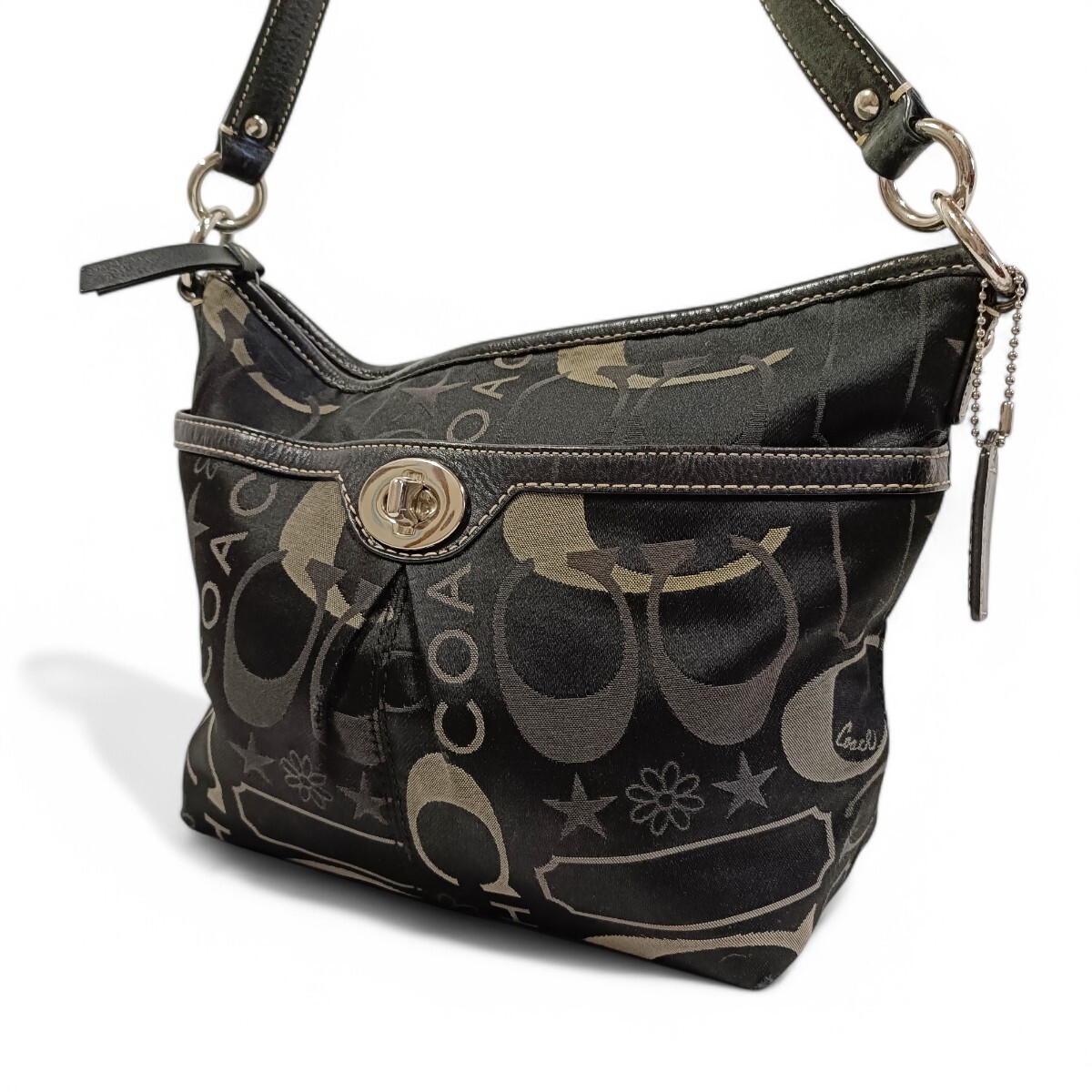 - 正規品 コーチ COACH ハンドバッグ キャンバス 総柄 黒 肩掛け ブラック ワンショルダー かばん 鞄 ロゴチャーム付き シグネチャー