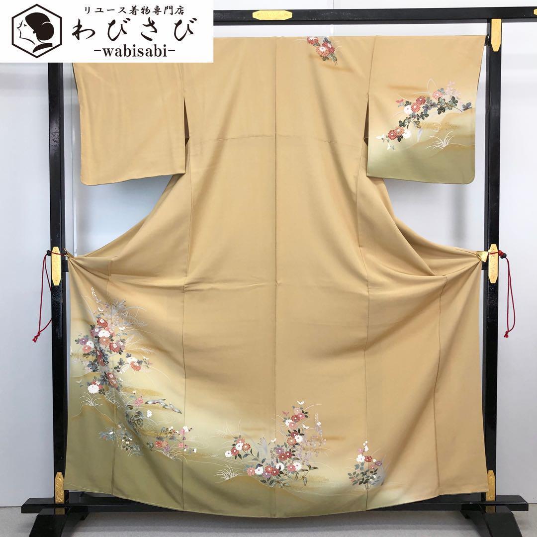 > 訪問着 友禅 美しい花模様 暈し 麦藁色 金彩 縮緬 トールサイズ K-4364