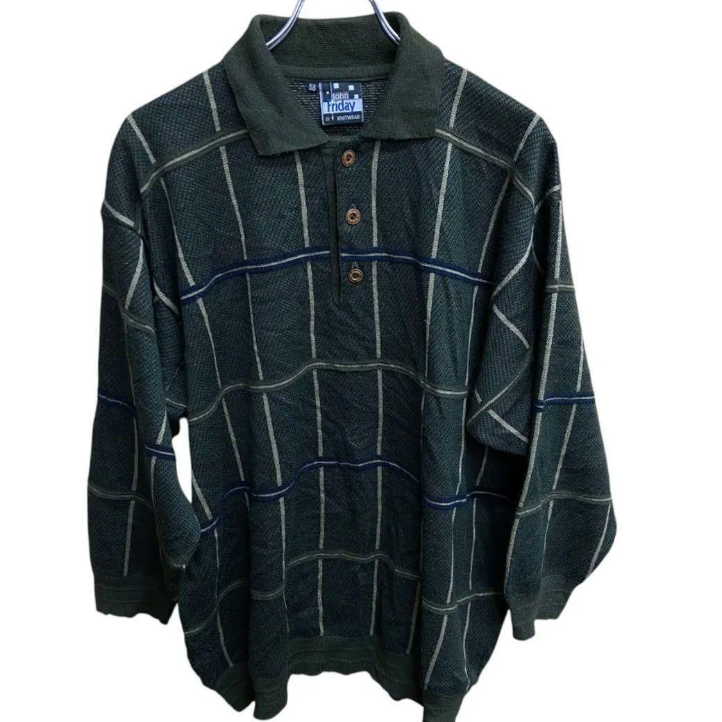 - メンズニットポロシャツ 緑 XL トラッド 秋冬物 ウール混【1074】