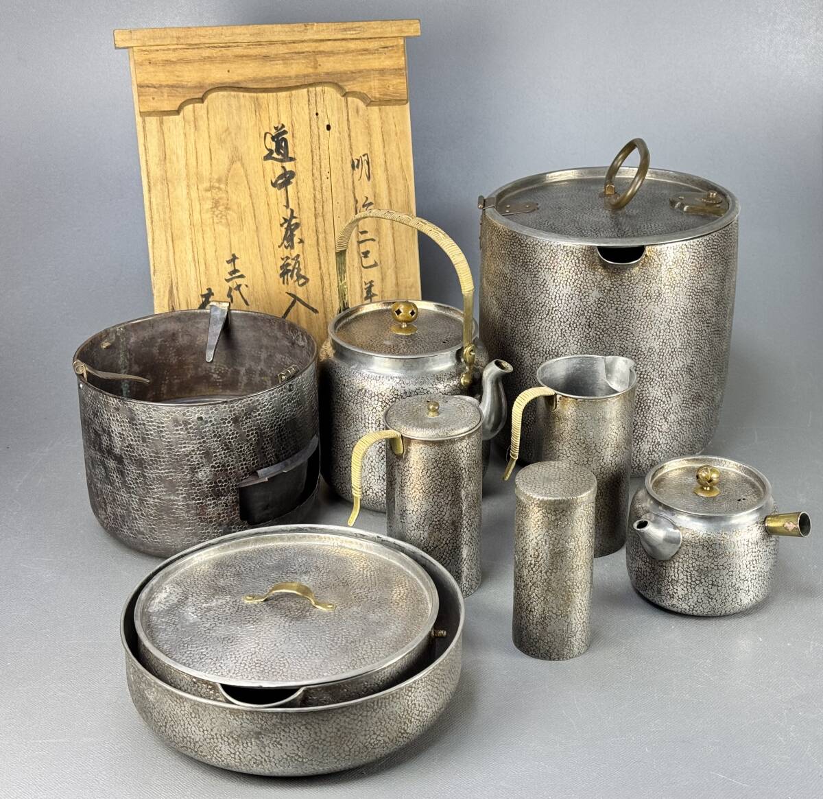 > 【偲】明治 煎茶道具一式 茶壺道中 涼炉 急須 建水 水指 槌目 茶瓶 茶粉入 共箱 金属 時代物 茶器 茶道具 r-108