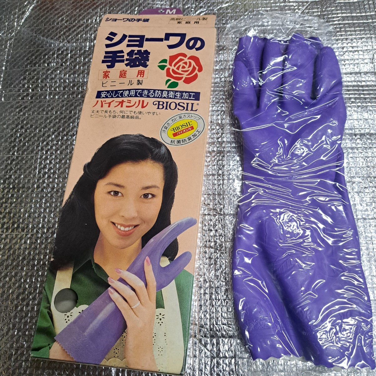 - ショーワ ビニール手袋 サイズ M 家庭用 ムラサキ バイオレット バラのデザイン 薔薇 長期保管品 昭和レトロ 尚和化工