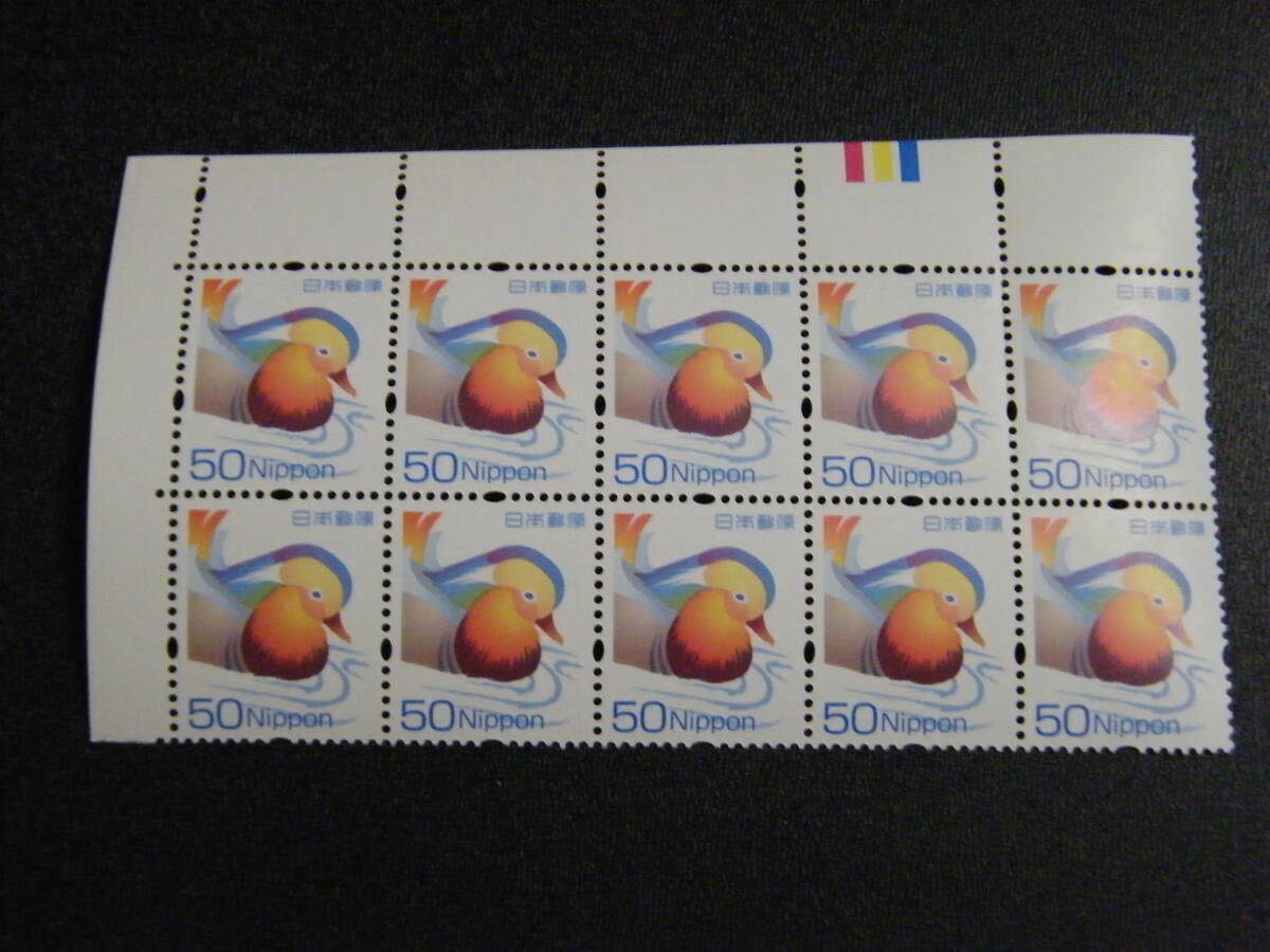 - オシドリ 50円 楕円目打ち カラーマーク上 10枚ブロック 未使用(CM付)